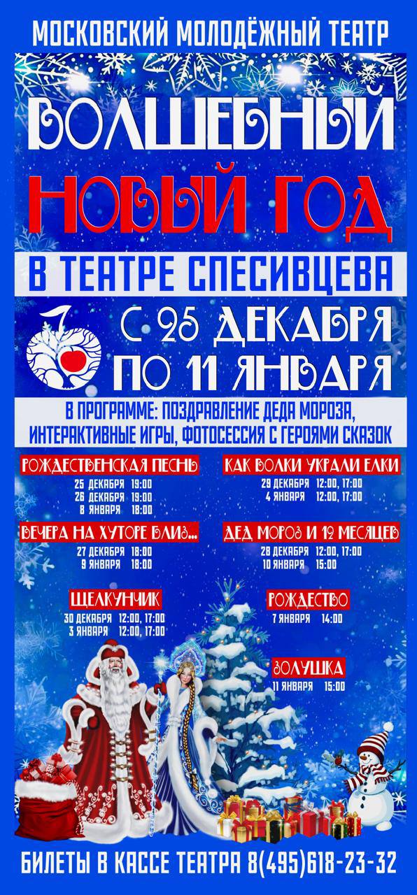 Московский Молодежный театр поздравляет вас с наступающим Новым годом и Рождеством, и желает вам крепкого здоровья и успехов во всех ваших делах. Мы подготовили для вас такую праздничную программу, чтобы никому не было скучно, чтоб все надолго запомнили встречу Нового года в театре Спесивцева! Следите за афишей на сайте театра! Встречайте 2025 год вместе с нами!